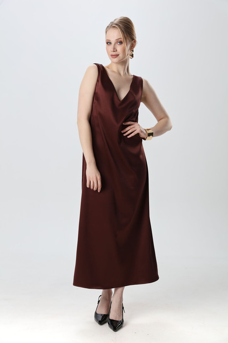 Платье прямого силуэта, с небольшим расширением к низу, длиной макси. Перед с нагрудной вытачкой из бокового шва. Вырез горловины переда и спинки имеют V-образную форму.