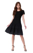 Эффектное двубортное платье длиной миди из облегчённого денима полуприлегающего силуэта. Линия плеча приспущена, рукав втачной три четверти с манжетой и патой. Горловина обработана обтачкой с V-образным вырезом. Линия талии акцентирована притачным поясом. Имеются карманы в боковых швах. Изделие застёгивается на кнопки. Без подкладки.