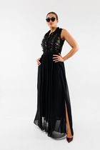 Лёгкое комбинированное платье, состоящее из лифа и юбки. Лиф прямого кроя с втачным рукавом с манжетой и патой на кнопки. Горловина обработана рубашечным воротником с отрезной стойкой. Застёжка центральная на кнопки. Юбка А-силуэта на подкладке.