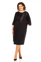 Платье свободного силуэта с фигурным лифом, на молнии по спинке, отрезное по линии талии. Горловина с V-образным вырезом. Рукава втачные три четверти. По переду подрезы по талии. Изделие на подкладке. В комплект к изделию идёт авторская съёмная брошь ручной работы.