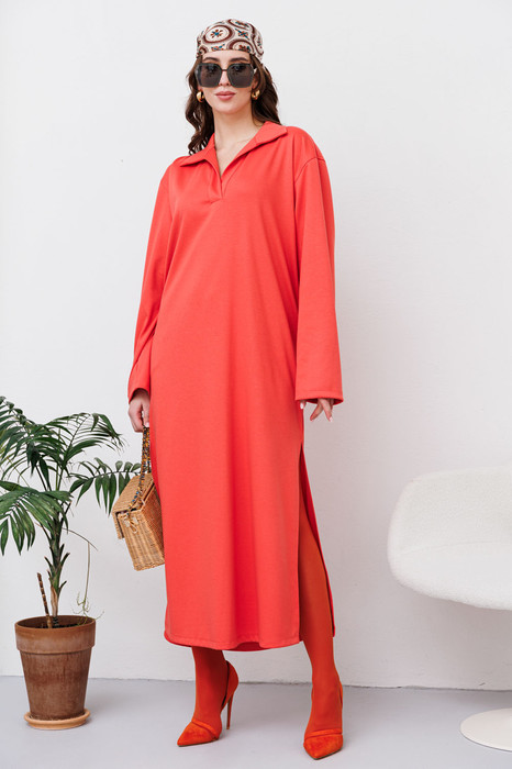 Комфортное платье трикотажное прямого силуэта свободного кроя с втачным рукавом со спущенной проймой в пол. По горловине переда планки с запахом. Воротник с цельнокроенной стойкой. В боковых швах расположены карманы. Изделие с разрезами по низу с обеих сторон