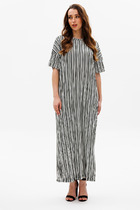 Комбинированное платье А-образного силуэта, отрезное по линии талии. Лиф изделия выполнен из трикотажной ткани, рукава и юбка - плательной.  По переду и спинке вертикальные рельефы.  Рукав втачной, низ рукава оформлен резинкой. Воротник - стойка. Застежка на тесьму -молнию, расположенную по центру переда и на воротнике. Изделие без подкладки.
