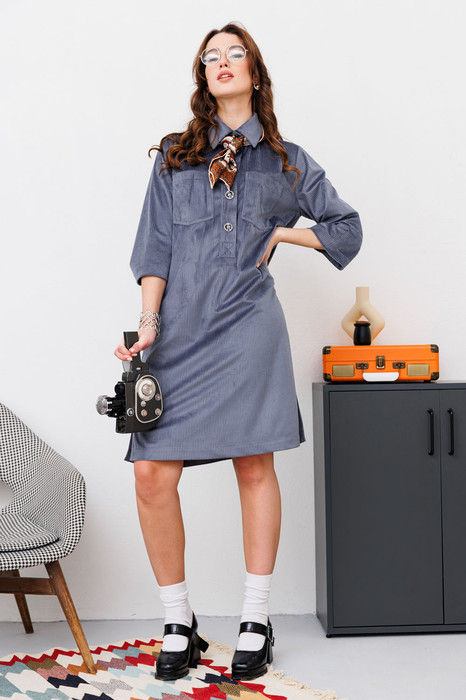 Женственное платье из замшевой ткани длиной миди свободного прямого кроя с горловиной, обработанной обтачкой. Рукава втачные длиной три четверти. Застежка центральная на петли и пуговицы. Накладные карманы. По боковым швам - разрезы. Изделие без подкладки.