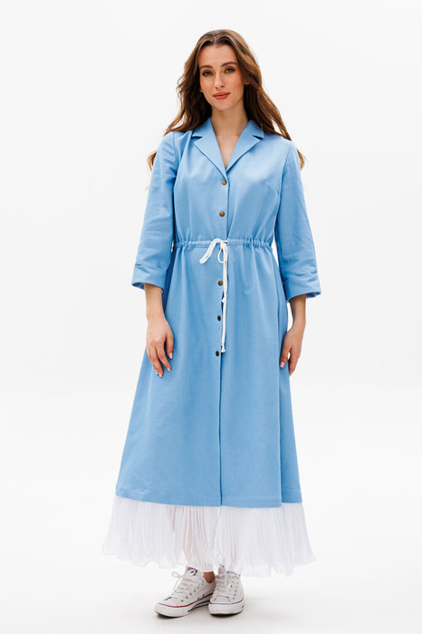 Классическое платье-рубашка из хлопка длиной миди с английским воротником на кулисе. По спинке фигурная кокетка.По низу изделия отделочная деталь из плиссе.  Рукава с цельнокроеными отворотами длиной 7/8. Застежка бортовая на кнопки.