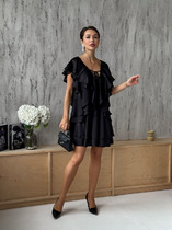 Платье трапециевидного силуэта без рукавов длиной мини с отложным воротником. Спинка и перед со средним швом и двойным втачным поясом. На переде небольшой разрез в шве по центру переда в области горловины. На юбке переда накладные карманы с вертикальным входом.