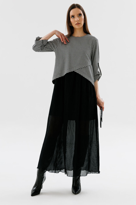 Платье макси комбинированное, двухцветное. Лиф ассиметричный по низу, с имитацией запаха, выполнен из костюмной ткани. Вырез горловины полукруглый, по спинке затежка на молнию. Рукава втачные, с манжетами и патами. Юбка на резинке, драпирующаяся, расширенного силуэта из плиссированного шифона. Изделие на подкладе.