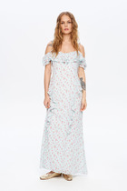 Платье состоит из двух платьев: нижнего и верхнего. Верхнее платье макси прямого свободного силуэта с воланом по низу изделия. Рукав втачной. Горловина обработана плосколежащим воротником. Центральная застёжка на петли и пуговицы. Нижнее платье комбинация на регулируемых бретелях.