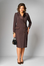 Платье прямого силуэта, состоящее из комбинации двух тканей - основной и отделочной. Воротник цельнокроеный хомут. Рукав одношовный, втачной, длинный. Нижняя юбка из отделочной ткани, со сборкой по линии талии. В виде отделки по левой части переда декоративный элемент из отделочной ткани.