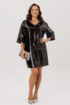 Платье прямого силуэта с отрезной завышенной линией талии по переду и на естественном уровне по спинке. Рукав длинный втачной одношовный на резинке по низу. Воротник -стойка. Верхняя часть переда с центральной застежкой на петли и пуговицы. Верхняя часть спинки с отрезной кокеткой и встречной складкой. По средней части переда и спинки настрочена кулиса, через петли которой выходит шнур для регулировки по талии. По низу платья пришит волан. Платье на подкладке.