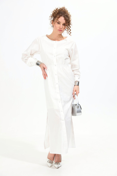 Комплект двухпредметный: состоит из платья-рубашки верхнего и платья-комбинации нижнего . Платье верхнее прямого кроя с центральной застёжкой на петли и пуговицы. По линии талии венгерка. Вырез горловины глубокий округлый. Линия плеча приспущена. На рукавах изделия заложены декоративные защипы, по низу - широкая резинка. Рукава - фонарики. Платье-комбинация на регулируемых бретелях прямого кроя.