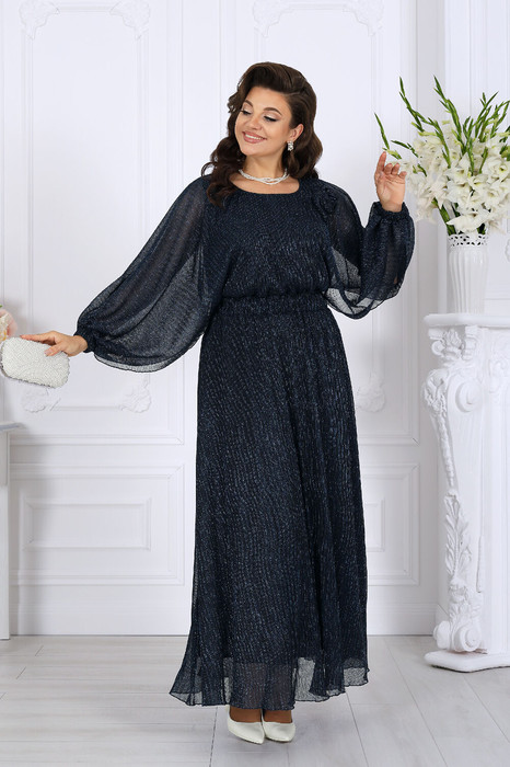 Платье женское, приталенного силуэта, выполнено из сетки-гофре с нитью «люрекс». Модель на трикотажной подкладке, без застежки и плечевых накладок. Платье отрезное по линии талии, со свободным лифом и расширенной к низу юбкой. Для лучшего прилегания в области талии в отрезном поясе предусмотрена эластичная лента, вставленная по всей длине. Лиф цельнокроеный с рукавами, без боковых швов -- с разрезами от талии до манжет. Для регулирования длины рукава внутрь манжеты протянута эластичная лента. Горловина округлая, окантована узкой косой бейкой из основного материала. Платье дополнено съемным «цветком» з основного полотна.
