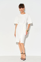 Платье женское полуприлегающего силуэта, выполнено из трикотажного полотна с фактурной лицевой стороной «люрекс». Модель на трикотажной подкладке, с плечевыми накладками. На правой части переда, вдоль отрезного пояса, заложены косые односторонние складки; детали лифа и юбки скреплены на запах. Низ платья асимметричный: правая часть переда удлинена к центру и оформлена углом, левая -- скругленная и входит в правый боковой шов. На спинке обработаны талиевые вытачки.  В левом боковом шве предусмотрена застежка на потайную тесьму-«молнию» (35 см). Рукав длиной 3/4, втачной. Платье дополнено съемным «цветком» из основного полотна. Длина платья-108 см; длина рукава-41 см.