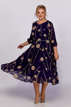 Платье женское полуприлегающего силуэта, выполнено из трикотажного полотна с фактурной лицевой стороной «люрекс». Модель на трикотажной подкладке, с плечевыми накладками. На правой части переда, вдоль отрезного пояса, заложены косые односторонние складки; детали лифа и юбки скреплены на запах. Низ платья асимметричный: правая часть переда -- удлинена к центру и оформлена углом, левая -- скругленная и входит в правый боковой шов. На спинке обработаны талиевые вытачки. В левом боковом шве предусмотрена застежка на потайную тесьму-«молнию» (35 см). Рукав длиной 3/4, втачной. Платье дополнено съемным «цветком» из основного полотна. Длина платья-138 см; длина рукава-41 см.