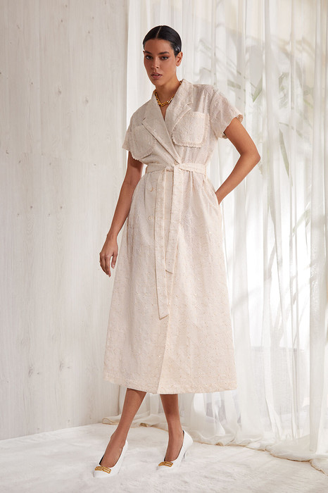 Платье А- образного силуэта,  выполнено из тонкого кружевного  фактурного хлопка ( шитье). Длина мidi. Двубортная  застежка на петли и пуговицы. Воротник пиджачного типа. На полочке накладные карманы, декорированы хлопковым кружевом.  Спинка прямая. В боковых швах карманы.   Чуть спущенная линия плеча. Прямой короткий рукав.