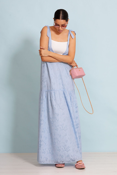 Изделие на хлопковой подкладке. Топ в комплекте. Стильное платье. Длина  maxi. Свободное в талии и  бедрах, в духе минимализма. Изделие без застежки.  V-образный вырез горловины и спинки. Регулируемые бретели.