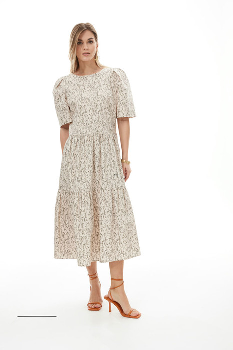 Изящное модное платье из хлопкового полотна. Модель свободной формы полуприлегающего силуэта расширенное к низу. Платье отрезное чуть выше линии талии с двумя ярусами воланов.