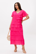 Изящное модное платье из итальянского шифона. Модель свободной формы, по линии талии вставлена резинка, расширенное к низу. Платье отрезное чуть выше линии талии с двумя ярусами воланов.