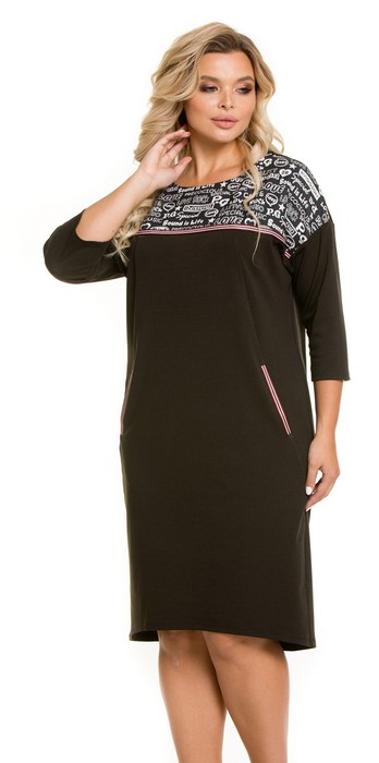Эффектное платье прямого силуэта, выполнено из эластичного трикотажного полотна. Платье по переду с притачной кокеткой и отрезными бочками. В швах притачивания бочков удобные карманы. Кокетка выполнена из отделочной ткани с модным принтом. Шов притачивания кокетки и вход в карман обработаны яркой трикотажной тесьмой. Спинка целая. Горловина переда и спинки в форме лодочка обработаны обтачками. Платье с удлиненной линией плеча и заниженной проймой. Рукав втачной, длиной 3/4 слегка зауженный к низу. Длина рукава от горловины в 46 р-ре – 48 см. в 56 р-ре – 53 см., ширина рукава по низу в 46 р-ре – 26 см. в 56 р-ре – 30 см. Низ платья фигурный, ассиметричный. Спинка длиннее переда на 7 см. Платье без застежек и подклада. Длина изделия по спинке в 46 р-ре – 104 см. в 56 р-ре – 107 см.