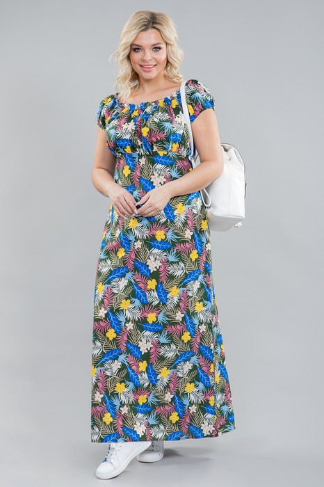 Легкое повседневное платье прилегающего силуэта длиной макси, выполнено из хлопкового полотна. Платье с отрезной завышенной линией талии. Перед и спинка верха целые со сборкой по шву притачивания. Низ переда целый, спинка с отрезными бочками, средняя часть спинки по талии собрана на шпульную резину. Рукав – реглан по низу собран на резину. Длина рукава в 46 р-ре – 15 см. в 58 р-ре – 17 см., ширина рукава по низу в 46 р-ре – 36 см. в 58 – 42 см. Горловина со сборкой на резину, что позволяет носить платье с открытыми плечами. Платье без подклада и застежек. Длина изделия по середине спинки в 46 р-ре –В В 130 см. в 58 р-ре – 136 см.