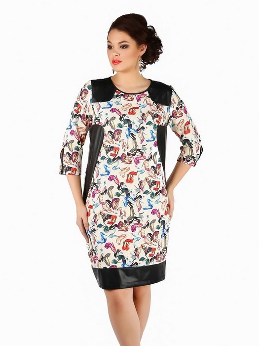Оригинальное молодежное платье,В В свободного силуэта, из трикотажного полотна, с фигурными вставками по переду и притачным низом из эко-кожи.В В По спинке и низу рукава разрез-капелька. Круглый вырез горловины переда и спинки и разрезы по спинке и низу рукавов обработаны окантовкой из эко-кожи. Рукав втачной длиной 3/4, слекга зауженный к низу. Платье без застежек и подклада. Длина изделия по спинке в 42 р-ре – 86 см., в 52- 94 см.