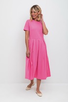 Платье на бретелях. Полуприлегающего силуэта до талии, расширяющееся к низу. Нижняя часть с притачными воланами со сборкой. Застежка – планка на петли и пуговицы. Верхняя часть переда и спинки с вертикальными рельефами. По верхнему, между воланами платье декорировано хлопковым кружевом.