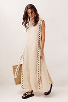 Платье выполнено из джинсовой ткани, полуприлегающего силуэта, покроя спущенное плечо, длинной за колено, зауженное к низу. Рукав длинный двушовный с манжетой по низу. Данное платье создает эффект блузы заправленной в юбку по талии. По переду и на спинке расположена горизонтальная кокетка, по спинке средний шов. По переду в шов притачивания кокетки вставлены клапаны. Горловина оформлена стояче-отложным воротником с отрезной стойкой. В верхней части переда расположена застежка-планка на пуговицы. В области талии по спинке и по переду расположен пояс-кокетка со шлевками. Нижняя часть платья оформлена как юбка – с разрезом по переду, с закругленными джинсовыми карманами в области бедер и застежкой на гульфик.