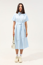 Платье свободного покроя, на бретелях, выполненных из декоративного шнура. Передняя и задняя половинки с небольшими сборками. Боковые швы с разрезами.