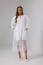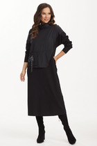 Платье полуприлегающего силуэта, со спущенным плечом, выполнено из трикотажного полотна, отрезное по талии. Верхняя часть переда и спинки более свободной формы. На переде расположена потайная планка на петли-пуговицы до подрезной линии. На левой детали переда в области груди расположена прорезная листочка – обманка. Воротник стояче-отложной с отрезной стойкой. В верхней части переда и спинки заложены односторонние складки, направленные к боковому шву. В нижней части переда расположен переходящий в разрез средний шов. На талии, по переду и спинке расположены вытачки. К платью прилагается пояс из основной ткани. Отделкой в данной модели служит фурнитура контрастного цвета.