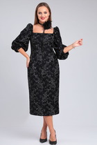 Платье женское, полуприлегающего силуэта, расширенное к низу, длинное с высоким разрезом в левом боковом шве. Платье отрезное под грудью, соединено с верхней частью частично по боковым швам и точечно по центру переда. Верхние части переда и спинки имеют рельефные линии. Платье с У-образным вырезом на брителях с регуляторами длины. В левый боковой шов вставлена потайная молния. Платье выполнено из атласной ткани.