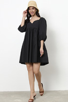 Платье женское, свободного силуэта с втачным рукавом, длина которого регулируется патой. Вырез горловины округлый, обработан притачной бейкой. По линии груди горизонтальный подрез. Застежка на полочке, на петли и пуговицы до подреза. Карманы в боковых швах. Декоративная брошь ручной работы в виде цветка.