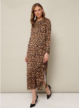 Платье женское А-образного силуэта (расширенное к низу) втачного покроя с центрально-бортовой застежкой на планку, на петли-пуговицы. Платье выполнено из ткани двух контрастных цветов. Рукав одношовный. Спинка со средним швом и кокеткой, горизонтально направленная. Перед ассиметричный. Правая часть состоит из верхней и нижней частей. В верхней части расположен накладной карман с клапаном и отделочной деталью. В боковых швах расположены карманы. К платью прилагается пояс из основной ткани с фурнитурой в цвет золота. Пуговицы металлические также имитируют золото.