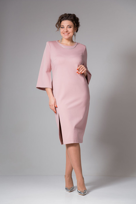 Платье женское, полуприлегающего силуэта, втачного покроя. Выполнено из трикотажного плательного полотна с блеском. Горловина округлой формы, задекорированная отделочной тесьмой по форме горловины переда. Спинка с талиевыми вытачками и средним швом, в котором расположена тесьма-молния. Рукава 7/8 с разрезом по шву до локтя. По переду расположены нагрудные вытачки и подрез закругленной формы, переходящий в разрез. Платье по фигуре и книзу заужено.