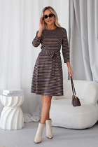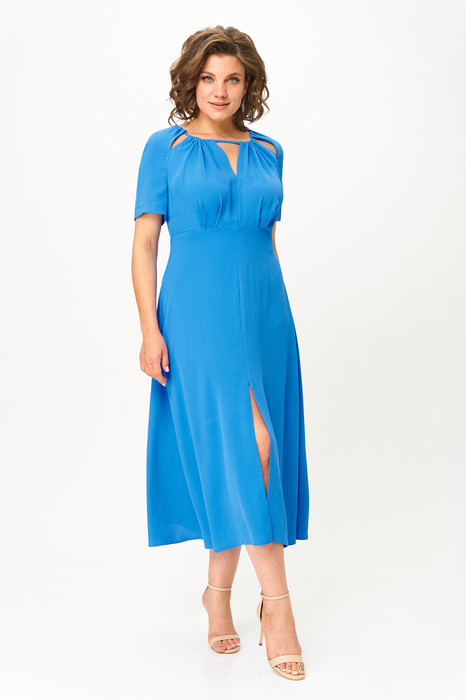 Платье женское полуприлегающего силуэта, отрезное выше талии. Нижняя часть со средним швом и разрезом. Спинка цельная, по отрезной линии талии собрана на резинку. Вся верхняя часть платья (перед, спинка и рукава) собраны на сборку протягивающимся шнуром, который завязывается сзади. По верхним частям переда и спинки разрезы. Рукав короткий, покроя «реглан».