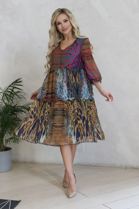 Летящее платье свободного силуэта из текстильной ткани шифон зелено-фиолетового цвета. V-образный вырез изделия обработан внешней обтачкой. По переду изделия выполнена планка с застежкой на пуговицы. Платье с завышенной линией талии и отрезной юбкой. Юбка изделия состоит из широких воланов дополненных сборкой. По низу втачных рукавов декоративная оборка. Длина изделия по спинке от плечевого шва до низа изделия — 107 см. Рост фотомодели — 170 см.