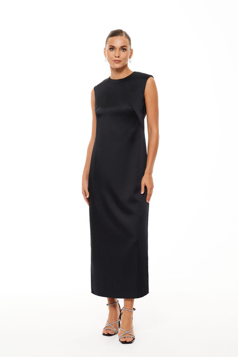 Платье женское атласное полуприлегающего силуэта. Платье подходит как для повседневной носки, так и для праздничных случаев. Перед имеет две нагрудные вытачки. Спинка имеет четыре талиевые вытачки и средний шов с потайной застежкой молнией в шве. В среднем шве по спинке имеет разрез к низу изделия. Горловина чуть заужена. Платье не имеет рукавов. Длина платья миди. Отличный вариант платья для вашего времяпровождения, в нем вы обязательно почувствуете себя уверенней.