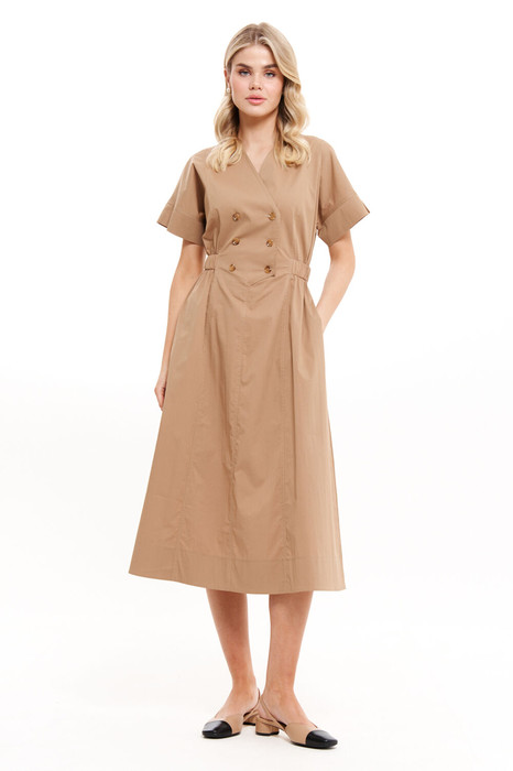 Женское платье классического кроя — стильное и универсальное решение для любого гардероба. Свободный фасон с расширенной к низу юбкой делает его комфортным для повседневного ношения, а двубортная застежка с пуговицами, имитирующими жилет, придает образу оригинальность. Это базовое платье отлично подходит для офисного стиля, весенних прогулок, деловых встреч и летних мероприятий.