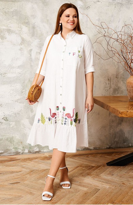 Стильное летнее платье из хлопковой ткани с легким эффектом крэн. Платье расширенного силуэта, по низу волан. Рукава длиной чуть ниже локтя с декоративной патой. по низу рукава притачная манжета. Застежка по переду на петли и пуговицы. На левой детали переда имеется нагрудный карман. Платье декорировано дизайнерским рисунком по низу платья и на кармане.