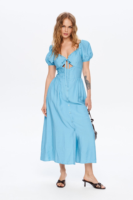 Детали: отрезная линия талии, фигурный лиф с регулируемыми завязками и оборками, застежка по переду на петли и пуговицы, юбка платья со сборкой по бокам, функциональные карманы, рукава короткие с резинкой по низу, платье на подкладке.