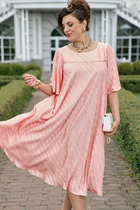 Платье А-образного силуэта. Округлый вырез горловины. Втачные короткие рукава, декорированные элементами из основной ткани в виде цветка. Застежка по спинке в среднем шве на потайную молнию. Платье без подкладки.