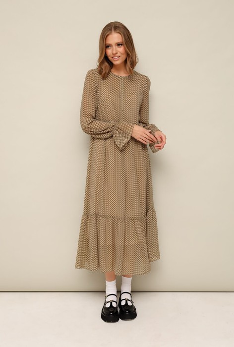 Платье из шифона с абстрактным принтом, отрезное выше линии талии. Горловина округлой формы. Лиф платья с застежкой на притачные планки с петлями и пуговицами. Нижняя часть платья с притачным воланом со сборкой. Рукава длинные втачные на резинке в области запястья. В комплекте прилагается нижнее платье-комбинация на регулируемых бретелях