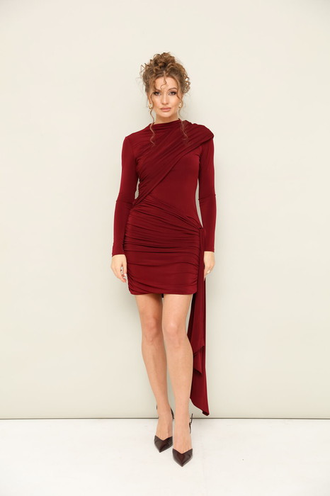 Платье прилегающего силуэта в длине мини, выполнено из эластичной ткани - масло. Горловина с цельнокроеной стойкой. Рукава длинные втачные. Перед и спинка декорированы диагональными деталями со сборкой в области лифа и бедер.