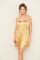 Платье полуприлегающего силуэта, длиной до середины бедра. Платье отрезное по линии талии. Лиф спинки с небольшой сборкой по шву притачивания к юбке. Юбка спинки с талиевыми вытачками. Лиф переда на запах, с односторонними складками. Юбка переда на запах с фигурной линией низа. По верхнему переднему полотнищу заложены мягкие односторонние складки от бокового. Рукава одношовные, короткие. Рукава выполнены на запах, с фигурной линией низа, со складками по окату. По горловине обработан рубашечный воротник на отрезной стойке. В правом боковом обработана застежка на потайную тесьму-«молнию».