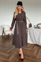 Платье прилегающего силуэта, длиной до середины бедра. Платье отрезное по линии талии. Лиф платья выполнен в виде корсета со шнуровкой по спинке. Юбка без бокового шва с мягкими складками от шва притачивания к корсету. За счет складок юбка имеет форму «тюльпана». Застежка на потайную тесьму-«молнию» в среднем шве спинки. Платье двойное, выполнено из основной ткани