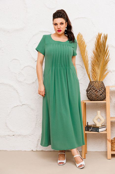 Платье женское предназначено для повседневной носки. Платье женское расширенное к низу, длинное. Перед с отрезной кокеткой, с двумя отрезными бочками, с двумя конструктивными подрезами внизу. Центральная часть переда с 8-ю декоративными складками. В швах соединения бочков с центральной частью переда обработаны карманы. Спинка со средним швом, с двумя декоративными конструктивными подрезами внизу от боковых швов. Горловина круглая, обтачная, без воротника. Рукав втачной, короткий, одно шовный. Ширина складки переда 1,5 см. Платье с плечевыми накладками. Длина спинки 133 см. Длина рукава 22 см