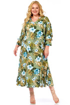 Платье женское отрезное по линии талии, расширенное к низу, длиной до середины икры. Верхняя часть переда с 2-мя нагрудными вытачками, нижняя цельнокроеная. Верхняя часть спинки с 2-мя таллиевыми вытачками, с обтачным разрезом по центру, фиксирующимся по горловине на 1-ну навесную петлю и 1-ну пришивную пуговицу; нижняя часть с 2-мя таллиевыми вытачками. Горловина круглая обточная, без воротника. Застёжка на потайную тесьму-молнию в левом боковом шве платья. Рукав втачной, одно шовный, по окату с лёгкой сборкой, длиной 7/8, низ собран на эластичную тесьму. Платье на подкладке. Платье без плечевых накладок. К платью прилагается отдельный ремень. Длина спинки платья 120 см, длина рукава 56 см.