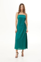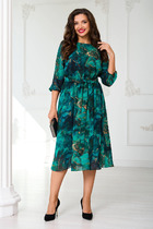 Платье женское отрезное по линии талии, расширенное к низу, длиной до середины икры. Верхняя часть переда с 2-мя нагрудными вытачками, нижняя цельнокроеная. Верхняя часть спинки с 2-мя таллиевыми вытачками, с обтачным разрезом по центру, фиксирующимся по горловине на 1-ну навесную петлю и 1-ну пришивную пуговицу; нижняя часть с 2-мя таллиевыми вытачками. Горловина круглая обточная, без воротника. Застёжка на потайную тесьму-молнию в левом боковом шве платья. Рукав втачной, одно шовный, по окату с лёгкой сборкой, длиной 7/8, низ собран на эластичную тесьму. Платье на подкладке. Платье без плечевых накладок. К платью прилагается отдельный ремень. Длина спинки платья 120 см, длина рукава 56 см.