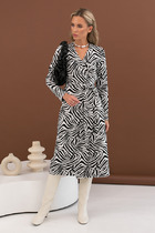 Платье женское предназначено для повседневной носки. Платье женское прямого силуэта, длиной за колено. Перед со средним швом, с 2-мя нагрудными вытачками, с 2-мя накладными с закруглёнными концами карманами на уровне линии бёдер, левый декорирован пришивным украшением. Спинка со средним швом. Застёжка на металлическую втачную молнию в среднем шве спинки. Горловина круглая, обтачная без воротника. Платье со спущенным плечом. Рукав втачной, одно шовный, длиной 7/8. Низ рукава декорирован металлической кнопкой, фиксирующей одностороннюю складкой. Платье без плечевых накладок. Длина спинки платья 106 см, длина рукава 43 см.