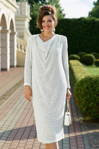 Платье женское, предназначено для повседневной носки. Платье женское отрезное по линии талии, слегка расширенное к низу, длиной до серединны икры. Верхняя часть переда с 2-мя нагрудными вытачками, с 2-мя вертикальными притачными планками, с 7-мью декоративными защипами шириной 0,3 см (с каждой стороны; нижняя часть переда с лёгкой сборкой по верхнему срезу по бокам). Верхняя часть спинки цельнокроеная; нижняя часть спинки с лёгкой сборкой по верхнему срезу. Платье с втачным поясом по линии талии с обработанной по ним кулисой с завязками с металлическими наконечниками. Горловина круглая с втачной стойкой. Застёжка центральная на верхней части переда на 5-ть вертикально обмётанных петель и 5-ть пришивных пуговиц. Рукав втачной, одно шовный длинный со сборкой и притачной манжетой, с застёжкой на обмётанную петлю и пришивную пуговицу. Платье на подкладке. Платье с плечевыми накладками. Длина спинки платья 126 см. Длина рукава 59 см.