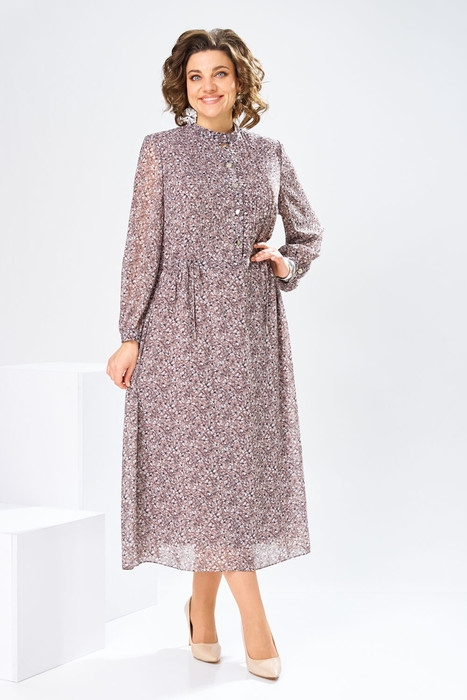 Платье женское, предназначено для повседневной носки. Платье женское отрезное по линии талии, слегка расширенное к низу, длиной до серединны икры. Верхняя часть переда с 2-мя нагрудными вытачками, с 2-мя вертикальными притачными планками, с 7-мью декоративными защипами шириной 0,3 см (с каждой стороны; нижняя часть переда с лёгкой сборкой по верхнему срезу по бокам). Верхняя часть спинки цельнокроеная; нижняя часть спинки с лёгкой сборкой по верхнему срезу. Платье с втачным поясом по линии талии с обработанной по ним кулисой с завязками с металлическими наконечниками. Горловина круглая с втачной стойкой. Застёжка центральная на верхней части переда на 5-ть вертикально обмётанных петель и 5-ть пришивных пуговиц. Рукав втачной, одно шовный длинный со сборкой и притачной манжетой, с застёжкой на обмётанную петлю и пришивную пуговицу. Платье на подкладке. Платье с плечевыми накладками. Длина спинки платья 126 см. Длина рукава 59 см.