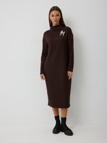 Платье женское, коктейльное. Платье женское, отрезное по линии талии, расширенное к низу, длиной до середины икры. Перед с 2-мя притачными вертикальными планками, верхняя часть с 2-мя односторонними складками по линии талии, нижняя часть переда с 2-мя зафиксированными односторонними складками. Верхняя часть спинки со средним швом и 2-мя односторонними складками по линии талии, нижняя часть так же со средним швом и 2-мя закреплёнными односторонними складками. Горловина круглая с втачным воротником рубашечного типа с отрезной стойкой, верхний воротник из отделочной ткани. Застёжка центральная на 11-ть вертикально обмётанных петель и 11-ть пришивных пуговиц. В боковых швах обработаны карманы. Платье со спущенным плечом. Рукав втачной, одно шовный, длиной 3/4. Окат рукава с 6-ю односторонними складками, низ со сборкой и притачной манжетой собранной на эластичную тесьму. Рукав и манжета из отделочной ткани. К платью прилагается съёмный пояс. Длина спинки 16 см, длина рукава 42,5 см.